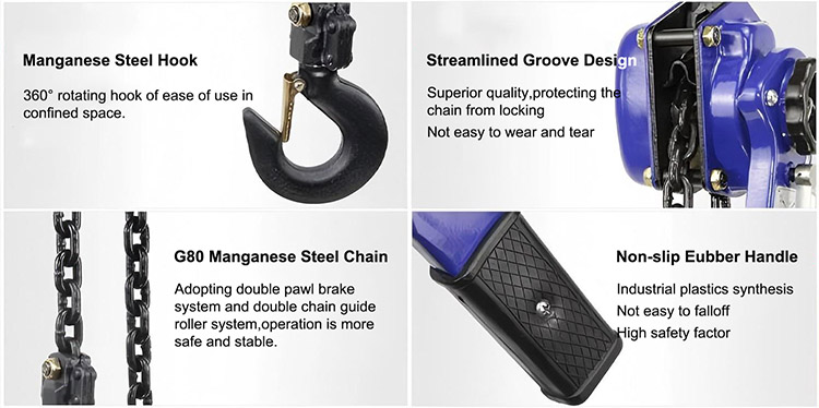 2. Altura de elevación estándar: 1,5 m, 3 m, 6 m, 10 m, 20 m, etc. (longitud de cadena única). La longitud de la cadena se puede personalizar.