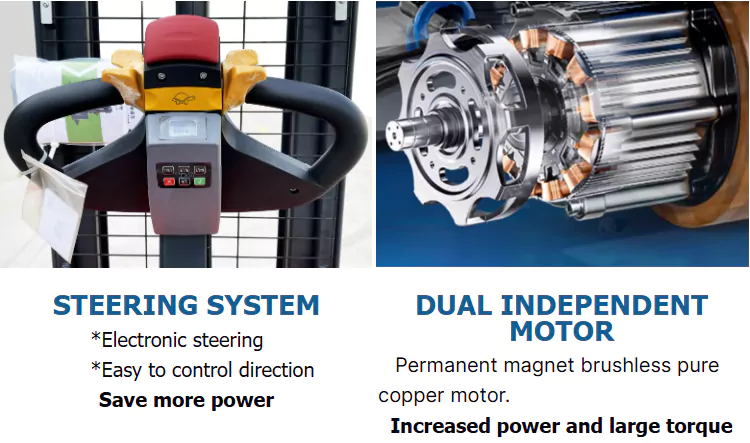El apilador totalmente eléctrico BaiYi utiliza una batería recargable o un motor de CA para accionar el sistema hidráulico y levantar la carga. El operador utiliza la manija de control para mover el apilador de paletas y levantar la carga. Esto lo convierte en una parte indispensable de las tareas de manipulación de materiales que requieren levantar y mover objetos pesados ​​con frecuencia.